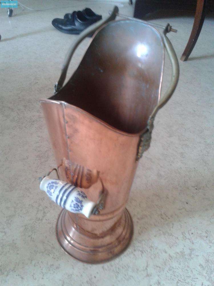vends un ancien grand seau en cuivre véritable on bronze doré martelé poignée en faience bleu il peu faire office de porte parapluie 0688919829