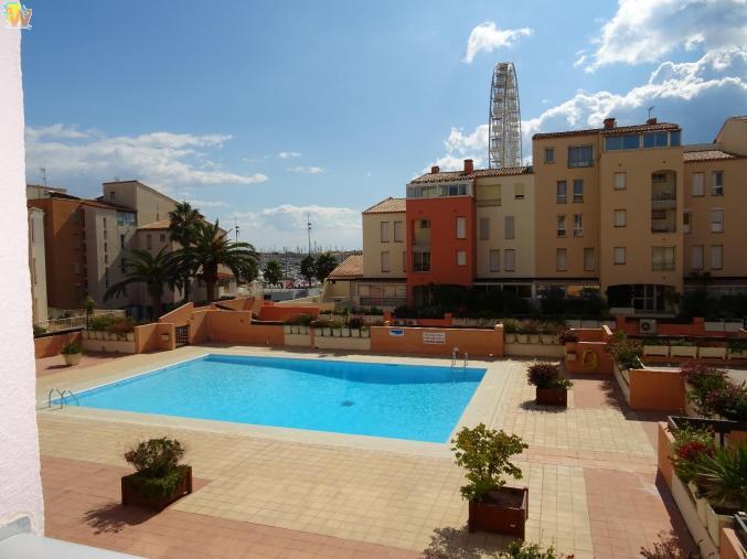 Cap d'agde, quartier centre port, joli et grand appartement Type 2, cabine transformée en une grande chambre, 1 er étage, grande loggia, vue picine et port, calme et agréable, placards, a deux pas du port et des commerces, résidence securisée, exposition sud.