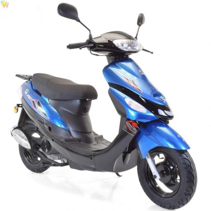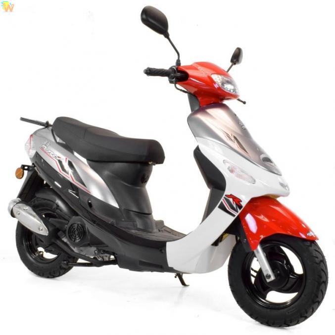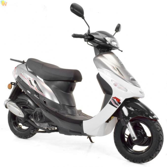 Scooter 50cc avec moteur 4 temps équipé de double béquilles, rangement sous selle et vide-poches, double démarrage électrique et kick.
